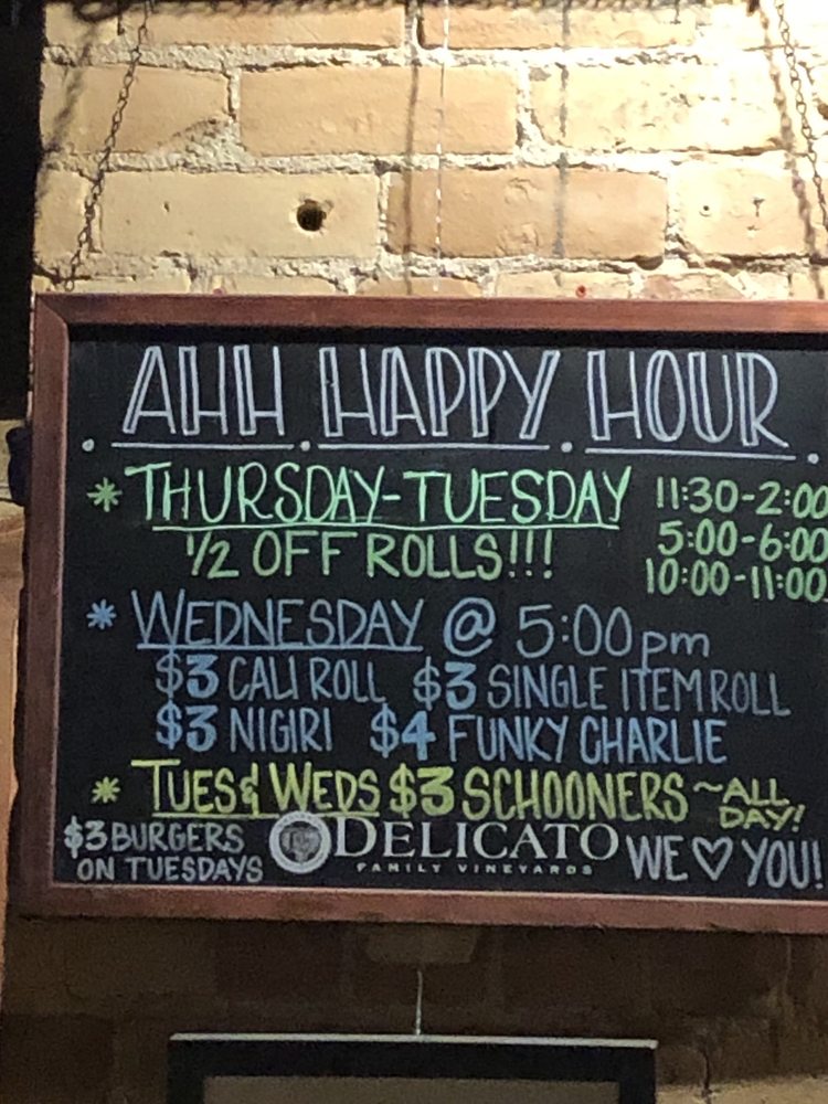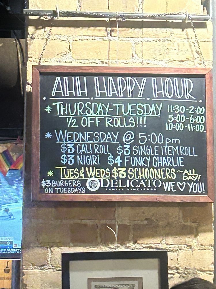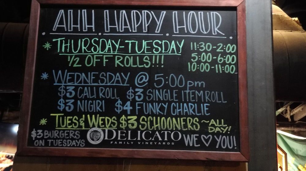 Introducing the menu at Ahh Sushi - a sushi bar located in Salt Lake City. Known for its diverse offerings, Ahh Sushi provides a range of tapas including Agedashi Tofu, Baked Green Mussels, and Chicken Teriyaki. Their sushi rolls are a standout, with options like California, Caterpillar, and Firecracker rolls. The menu also features unique items like the Ahi AhhBurger and Fried Pickles. With a casual atmosphere and options for takeout and delivery, Ahh Sushi caters to a variety of preferences. The outdoor seating and happy hour specials make it a great spot for groups or a casual dinner. Don't miss out on the diverse flavors and fresh ingredients at Ahh Sushi.